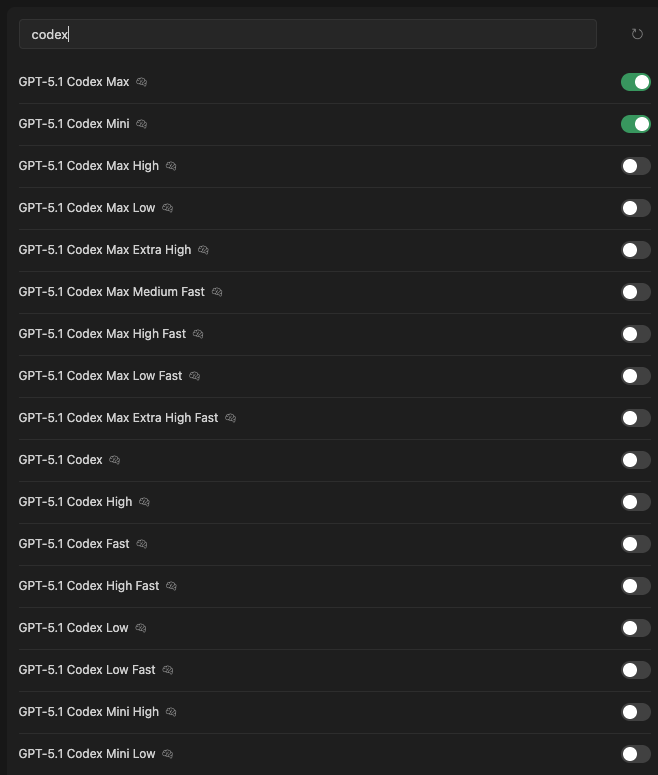Cursor provides an extensive lineup of GPT-5.1 Codex variants, each optimized for distinct trade-offs in intelligence, speed, and resource use. You access them via the model selector in the IDE, where toggles indicate availability and current selection. Below, we introduce each one, highlighting core attributes derived from Cursor's harness documentation and internal benchmarks.