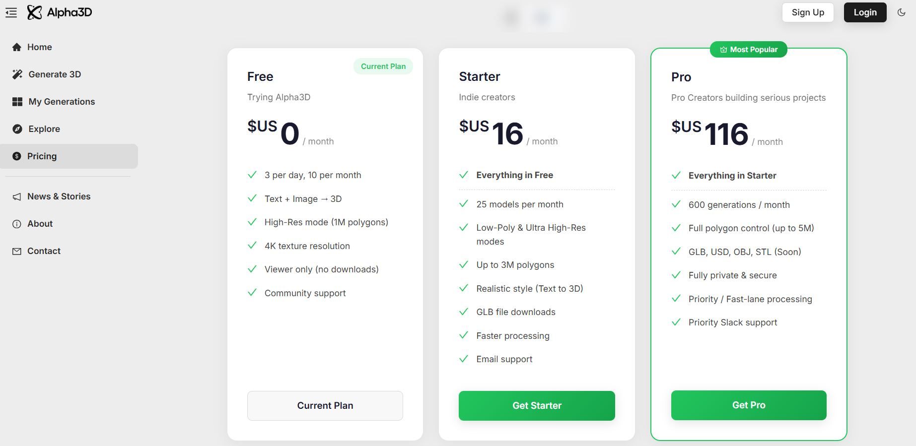 Alpha3D targets enterprise customers requiring scalable infrastructure, dedicated support, and white-label integration options. The platform provides both text-to-3D and image-to-3D pipelines through a managed REST API.