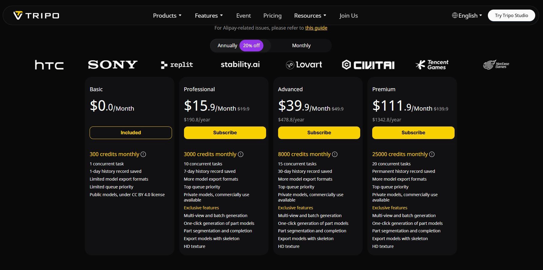Pricing: $15 for 2500 credits with no monthly fees. Approximately 50 credits per image-to-3D generation. New users receive 250 bonus credits.