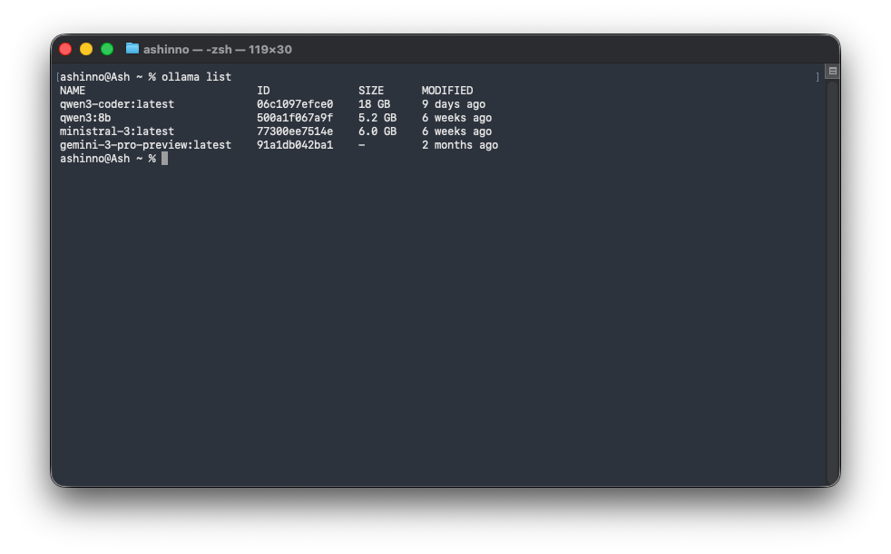 Once installed, Ollama starts a local server at port 11434. Developers verify this by running ollama list, which displays available models.