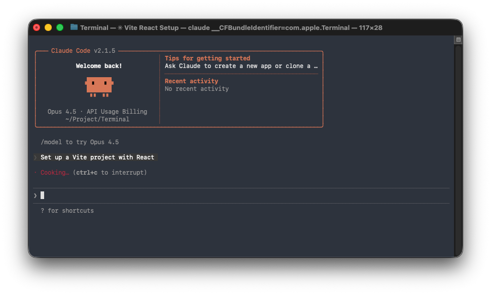 Claude Code responds by running "npm create vite@latest . -- --template react", configuring the environment automatically.