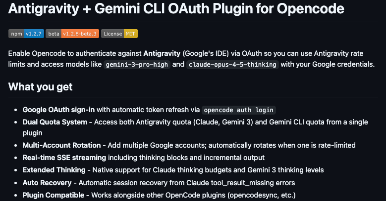Furthermore, Opencode's open-source nature encourages community contributions, resulting in plugins like opencode-antigravity-auth. This plugin bridges Opencode with external services, enabling authentication and model invocation without proprietary locks. Developers appreciate its lightweight design, which runs on Linux, Mac, and Windows with minimal dependencies—primarily Python and basic CLI tools.