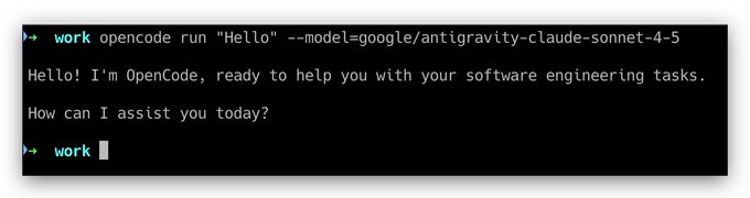 opencode run "Hello" --model=google/antigravity-claude-opus-4-5-thinking-low