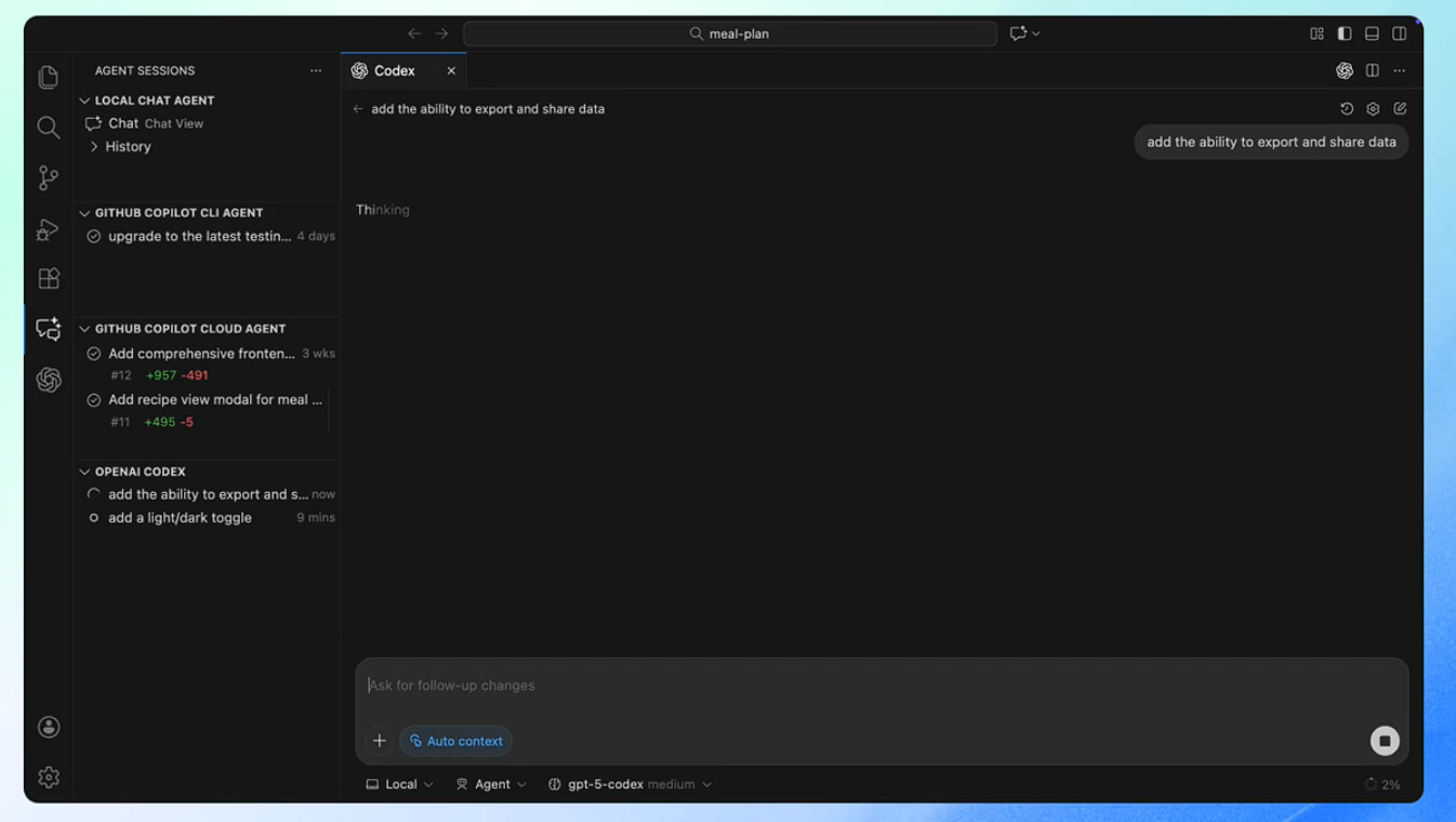VSCode's Agent Sessions view serves as the hub for managing AI interactions, including the new OpenAI Codex integration. This interface lists active sessions, tracks progress, and facilitates task delegation between local and remote agents.
