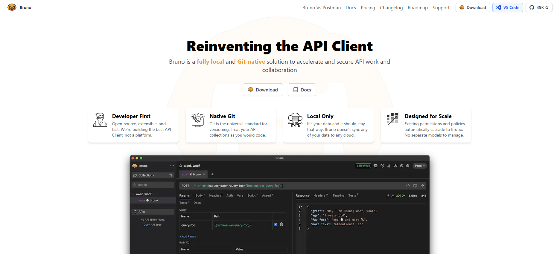 Bruno is a breath of fresh air in the API tooling space. It treats your API collection as a folder of plain-text files (YAML/JSON) on your local machine just like source code.