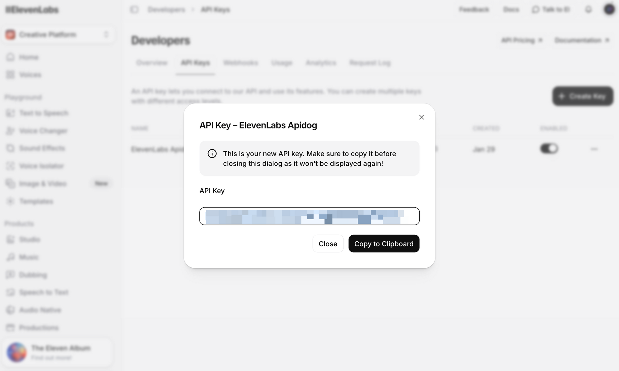Step 3: Click Create API Key. Copy the key and store it securely—you won't be able to see the full key again.
