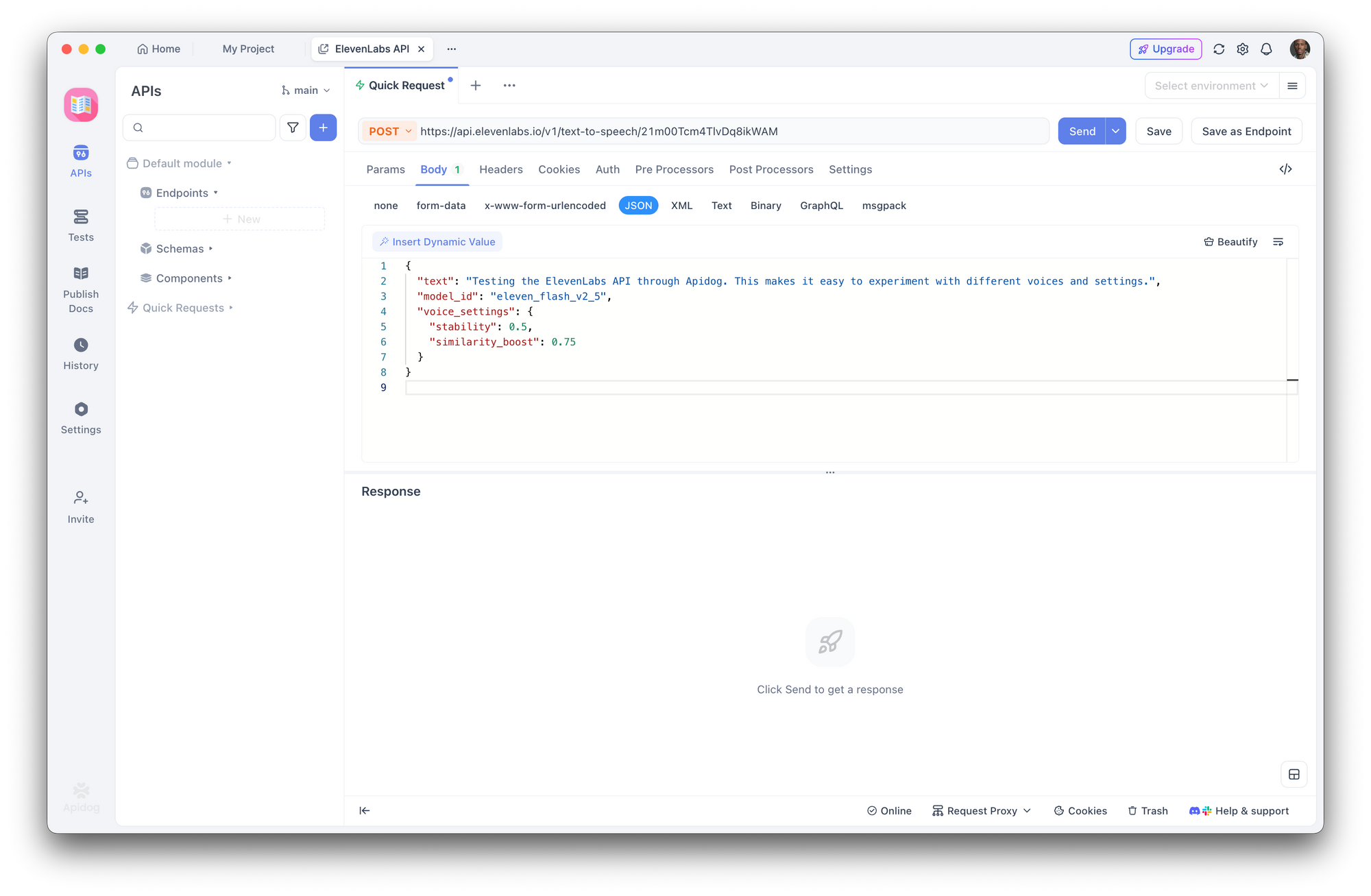 "text": "Testing the ElevenLabs API through Apidog. This makes it easy to experiment with different voices and settings.",