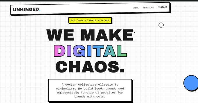 A user prompted Gemini 3.0 to "Make a neobrutalist webpage, make it extremely creative, as far as possible, push the limits. Add smooth scroll animations, add fancy colors and tailwind css styles. Make it responsive." The result? A vibrant, chaotic design featuring bold typography and gradient effects, exemplified by a site titled "UNHINGED" with the slogan "WE MAKE DIGITAL CHAOS."