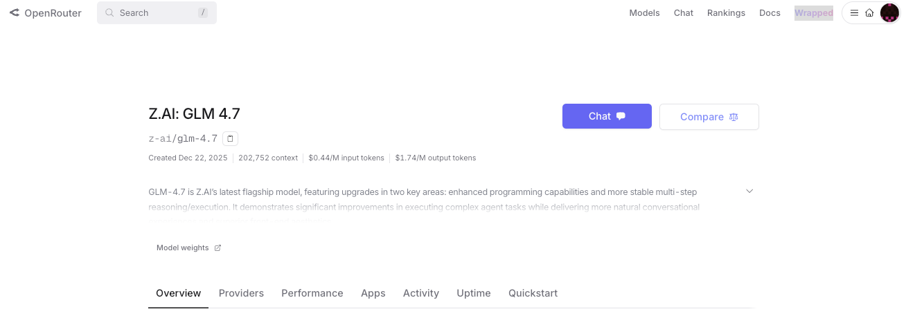 OpenRouter aggregates GLM-4.7 from multiple providers, including Z.ai, AtlasCloud, and Parasail. This route offers fallback options for reliability and competitive pricing.