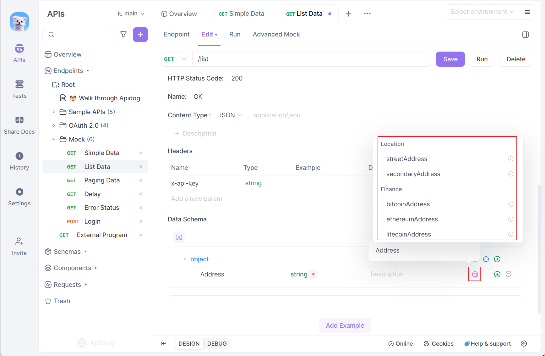 This is the magic. Apidog doesn't just return random strings. You can configure mock rules to return realistic, dynamic data. The platform can generate smart data based on the field name and type.