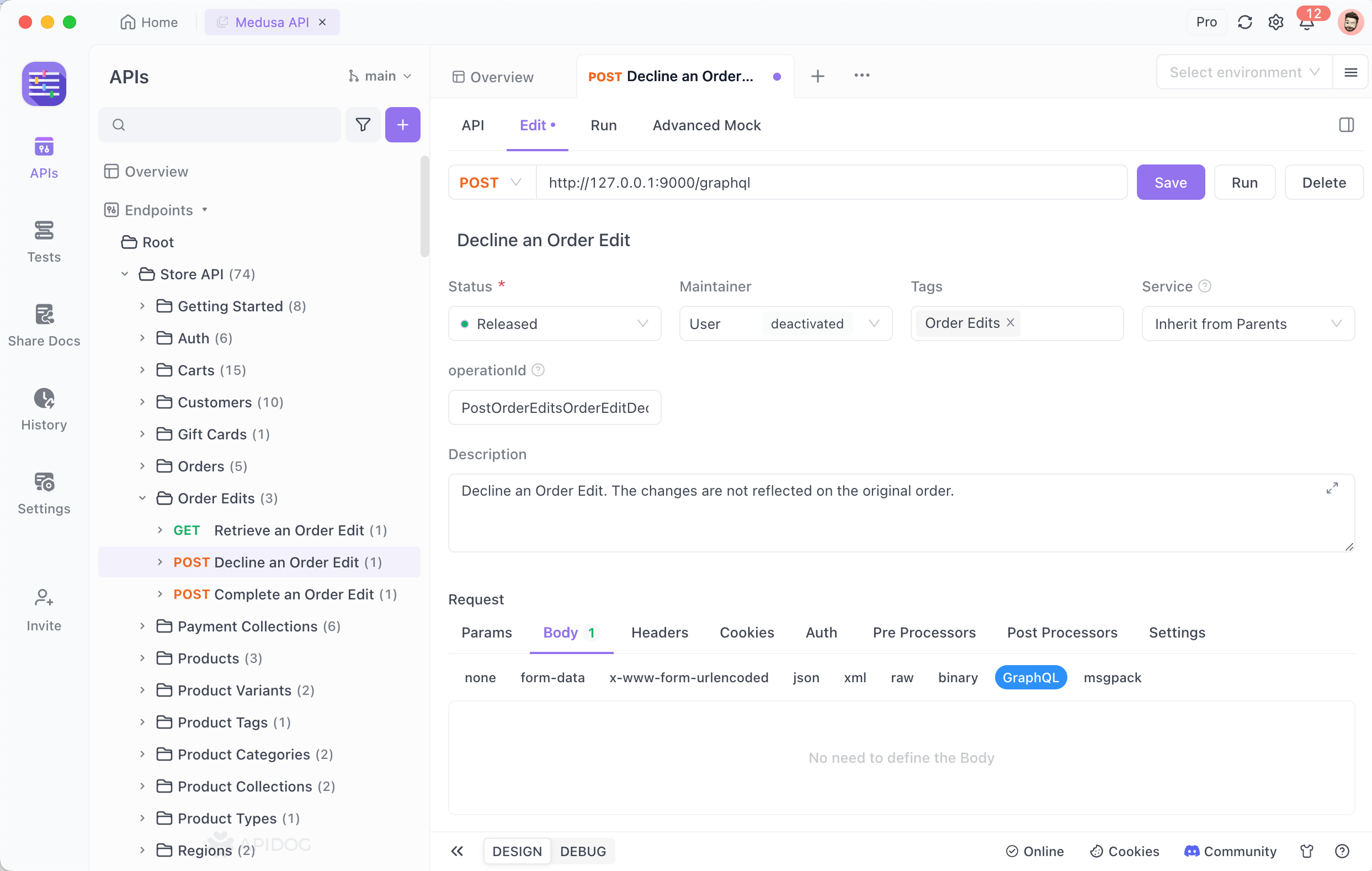 First, fire up Apidog and create a new request. Select GraphQL as the request type in the request body. This changes the interface to provide a dedicated GraphQL query editor and a built-in documentation explorer, which is a game-changer.