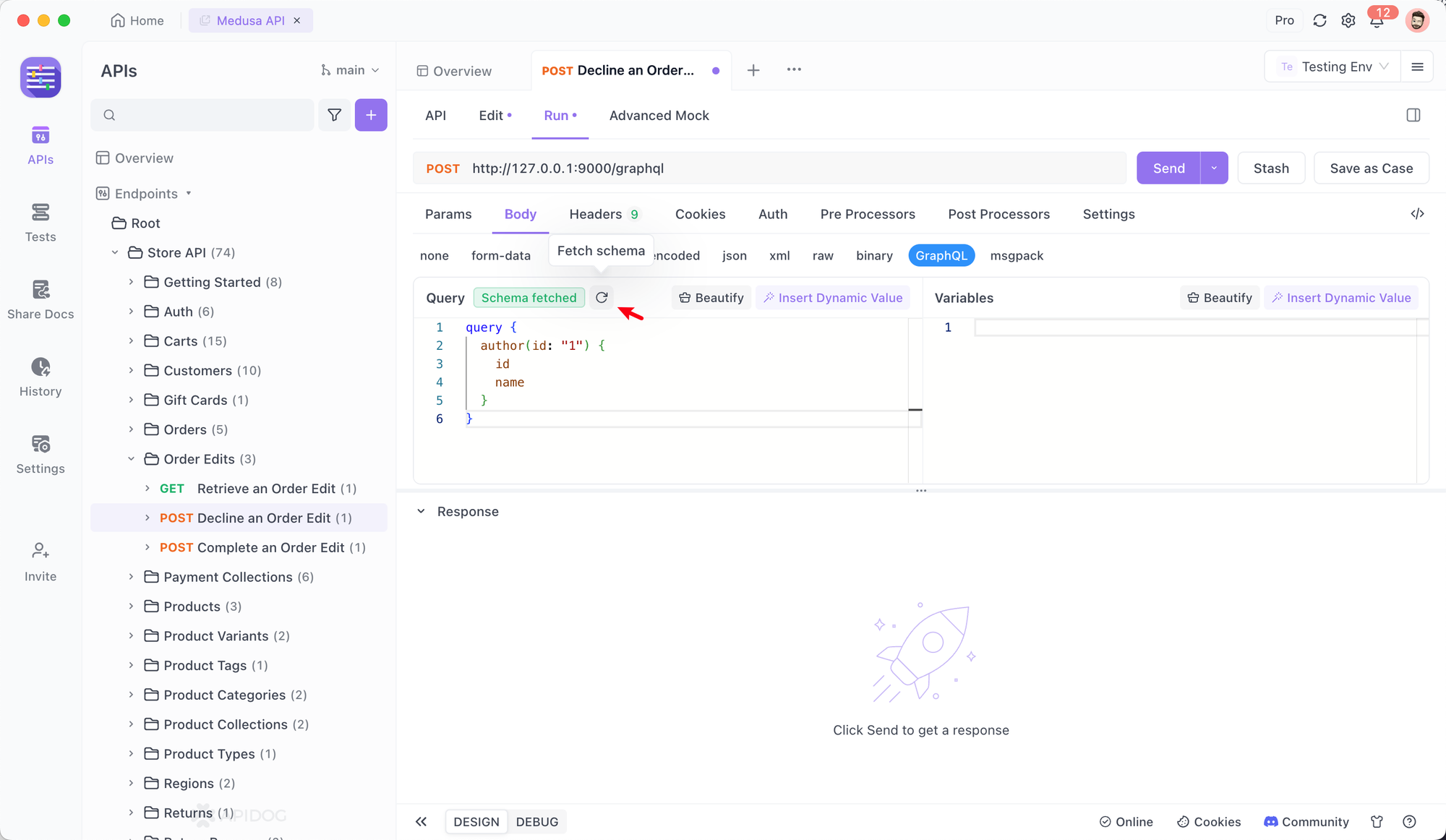 Fetch Schemabutton in the input box to enable the "code completion" feature for Query expressions, assisting in entering Query statements. - For Mutations: Write your data-modifying operation. The process is identical; you just use the