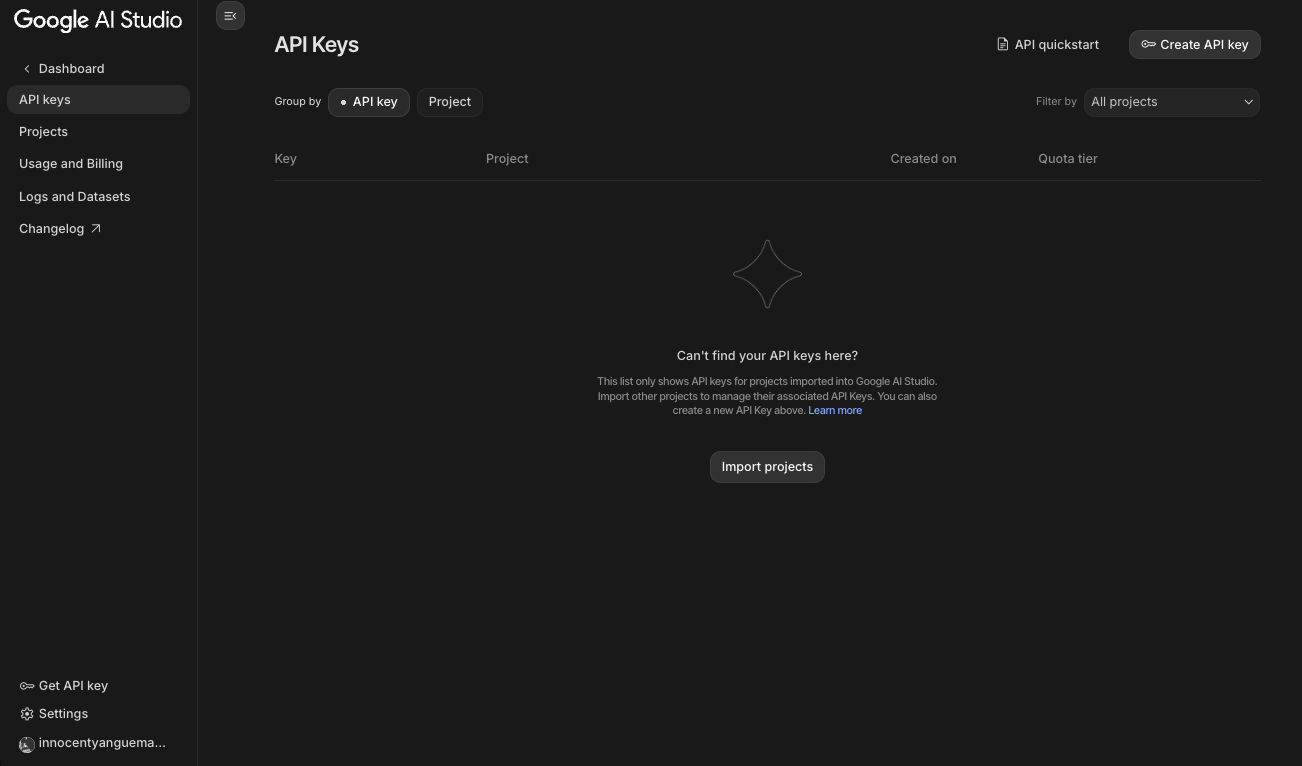 4. Click the profile icon in the top-right corner and select "Get API key". Choose "Create API key in new project" (or select an existing one).