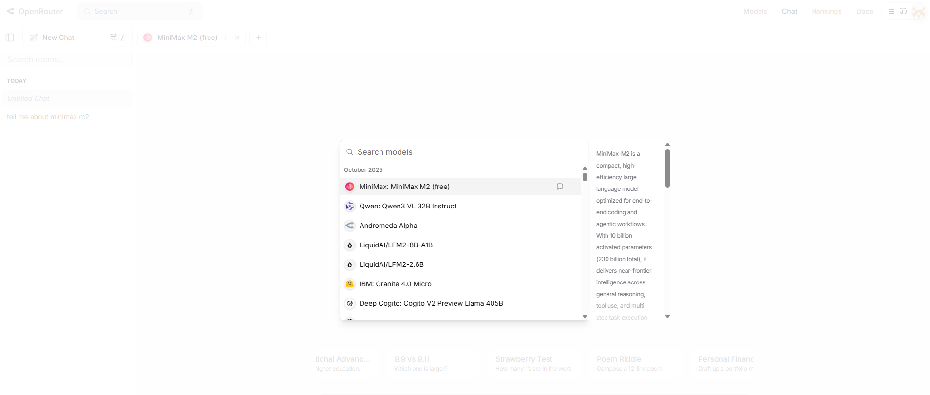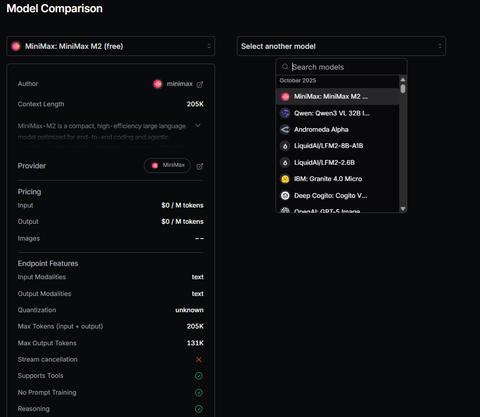 One of OpenRouter’s biggest strengths is model swapping. Want to see how Minimax M2 stacks up against Claude 3.5 Sonnet or Mistral Large?