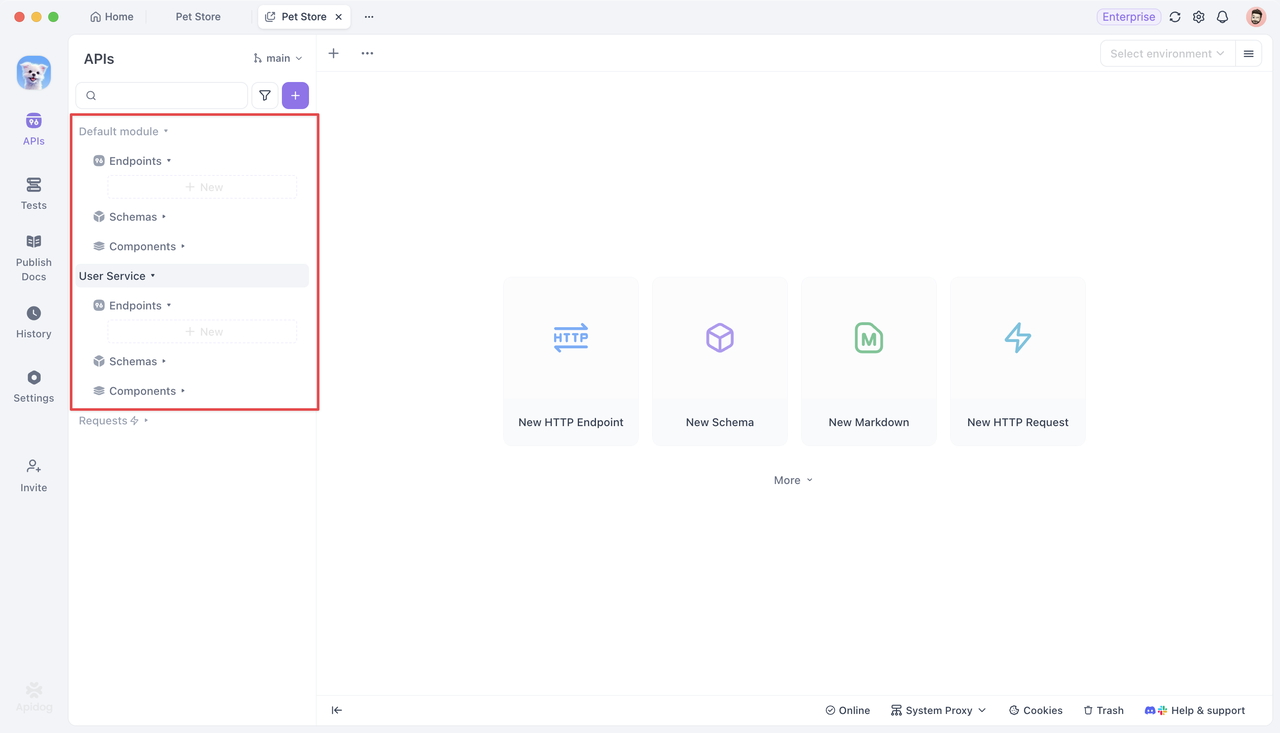 When you create a new project, Apidog automatically generates a default module. If your project only contains a single backend service or a small set of endpoints, this default module is usually sufficient. However, if you need to manage multiple distinct API services, you can create a separate module for each one.