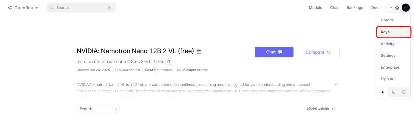 OpenRouter standardizes the API interface to mimic OpenAI's format, which simplifies migration for developers familiar with GPT endpoints. The base URL for requests is https://openrouter.ai/api/v1, and you specify the model as nvidia/nemotron-nano-12b-v2-vl:free. This tag ensures you hit the free tier endpoint, avoiding any inadvertent charges.