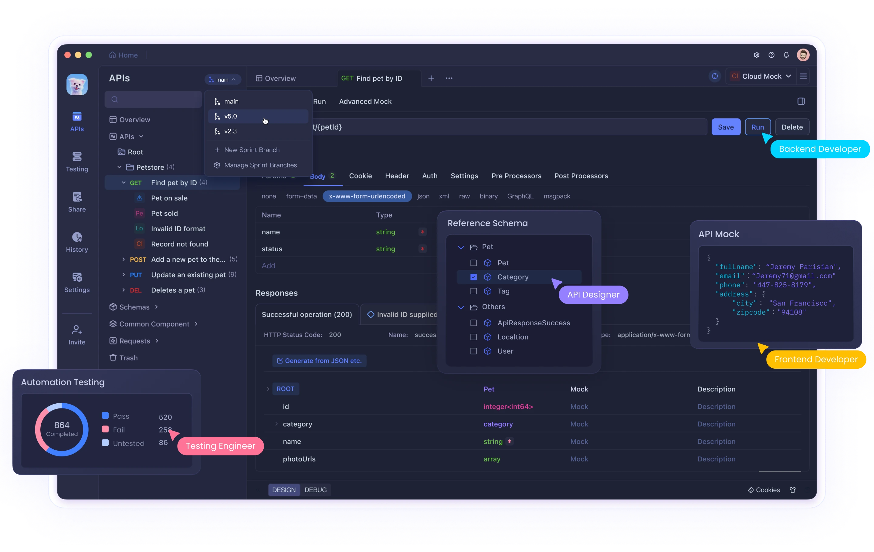 - Built-in mock servers and environment management