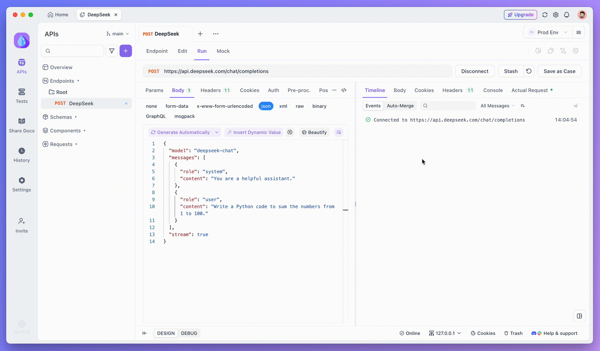 - Debugging streaming responses: Apidog handles SSE (Server-Sent Events) natively, letting you inspect streaming responses from LLM APIs in real-time.