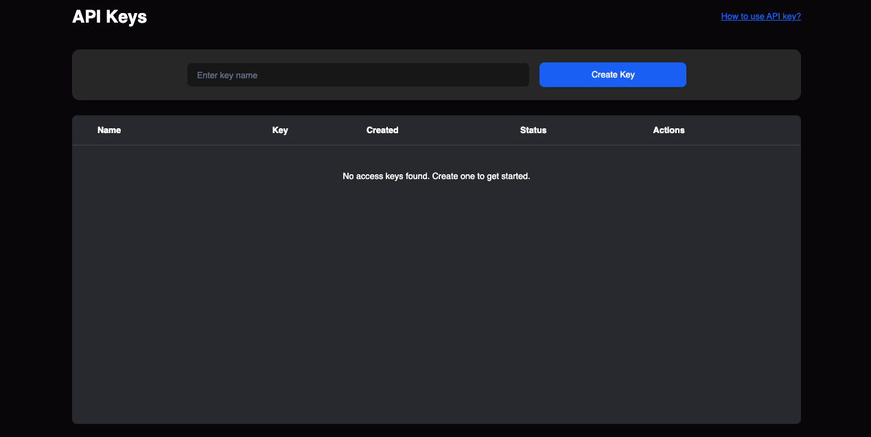 Click "Create Key" to create one. The system produces a unique string—copy it immediately, as it appears only once. Store it securely in environment variables or a key manager.