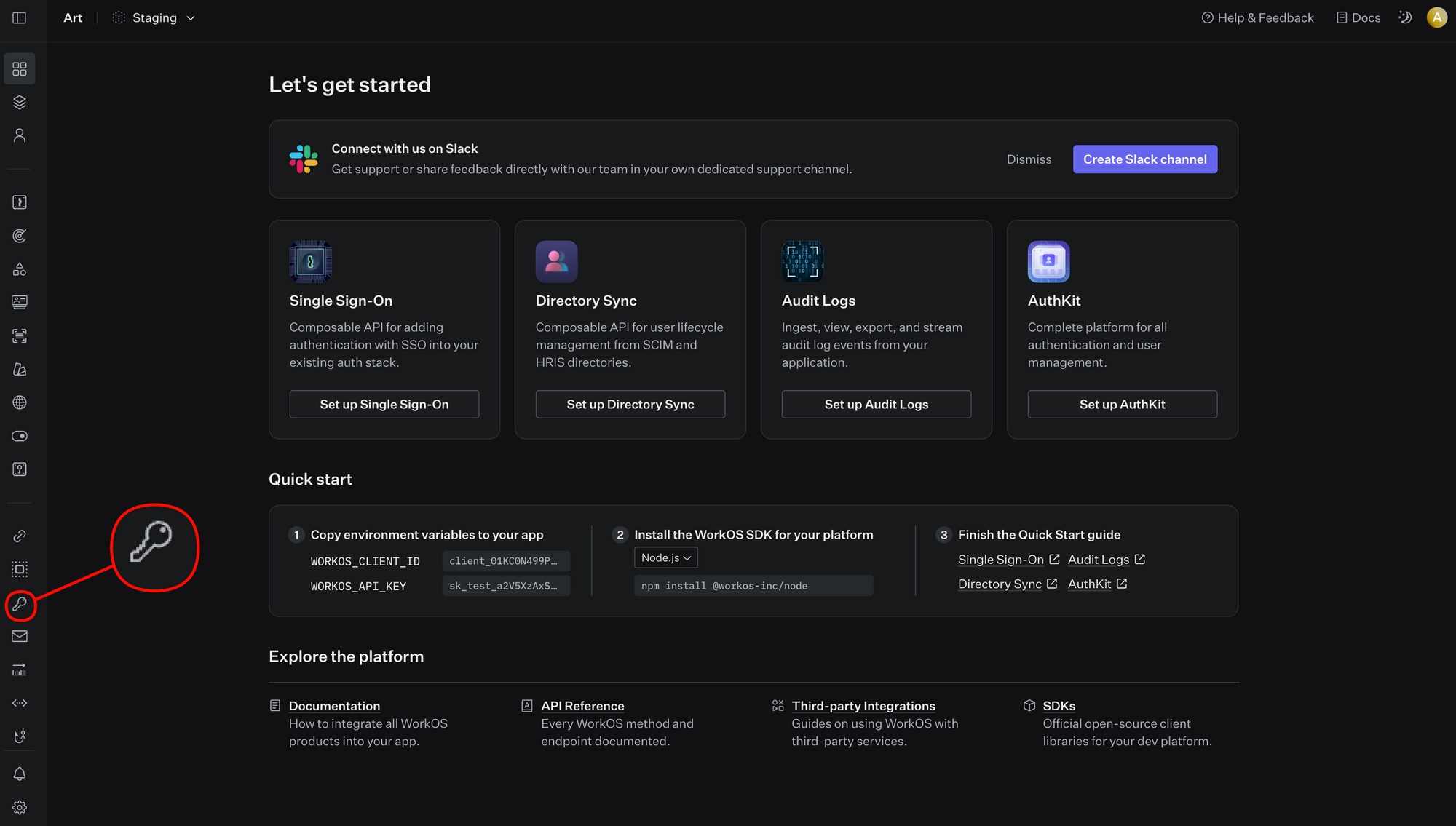 Developers access the WorkOS API through a straightforward process that emphasizes security and ease. Begin by creating a WorkOS account. Once logged in, navigate to the Dashboard's API Keys section.