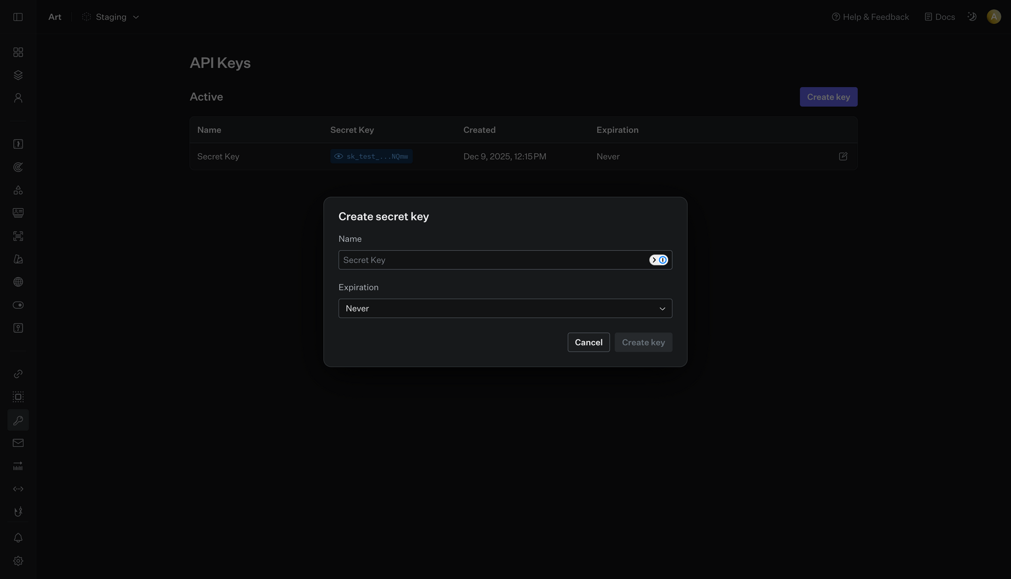 Generate a secret key prefixed with sk_—this serves as your Bearer token for all requests. Production keys display only once, so store them securely in environment variables or secret managers like AWS Secrets Manager.